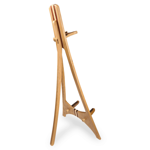 Handcrafted Wisconsin Hardwood acoustic or electric guitar stand crafted from Cherry wood with Bubinga and Maple accents. This stand is designed to beautifully present your prized  guitar. The neck support is height adjustable up to 10″ to allow for the best place to rest your instrument, and lower support arms firmly hold  guitar bodies. Contact areas are covered in glove soft leather with deep foam padding to cushion your instrument. All stands are handmade with attention to selecting wood with the most character to highlight the beauty of the wood. Each stand is unique because of the natural variations of the wood, so each stand will be a one-of-a-kind. All frames are assembled with wood tenons and sealed with 5 coats of oil and urethane for luster and protection. Assembly is easy, takes less than a minute requiring only a Phillips head screwdriver. These stands are meant for indoor use and should not be used outside or in damp environments. Lead time for this stand is typically 3 weeks from the date of order to shipment. Stand can also be used with electric bass guitars and banjos.