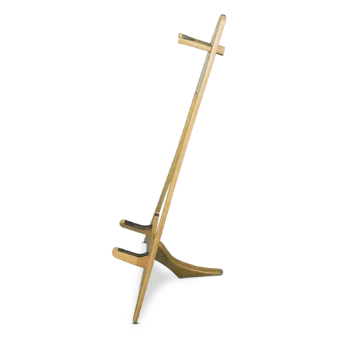To care for the stand, use furniture oil, i.e. Old English, or carnauba wax. Use non-silicone leather care products to condition the stand’s guitar body and neck cushion pads.